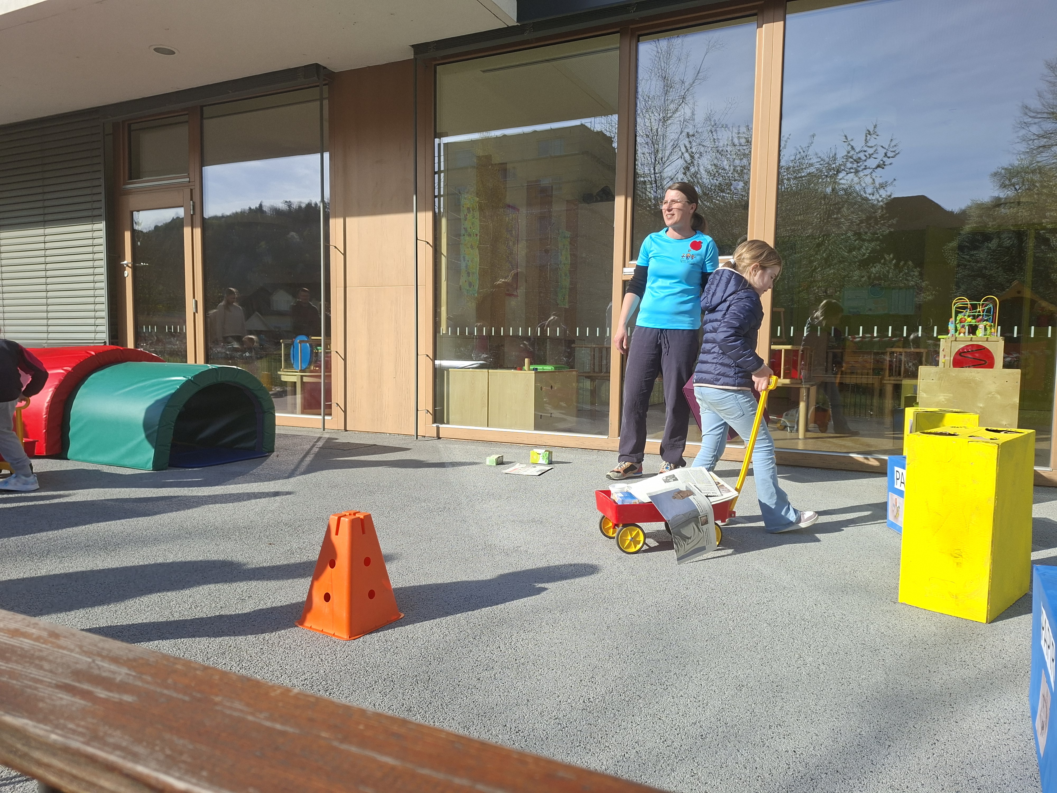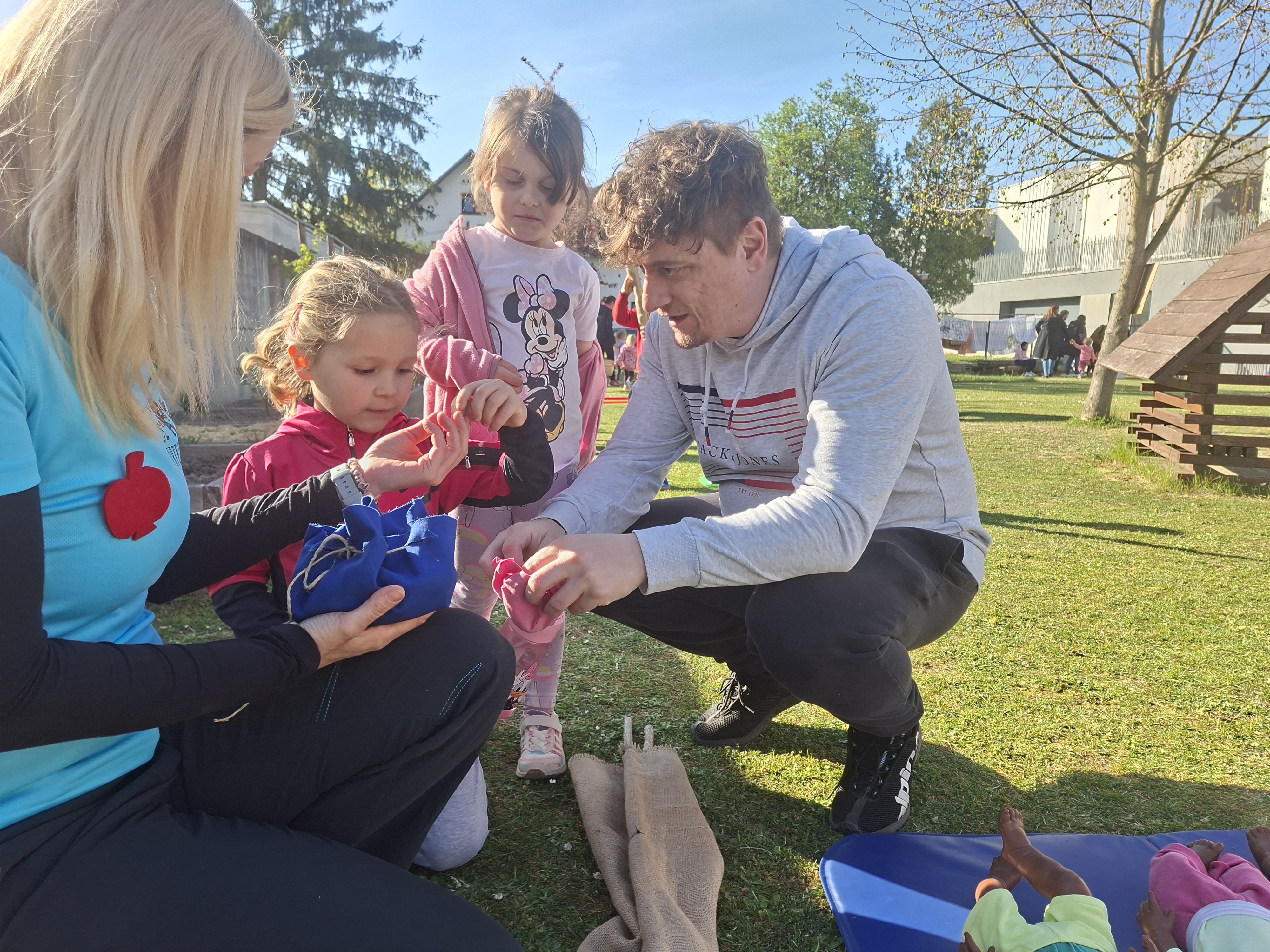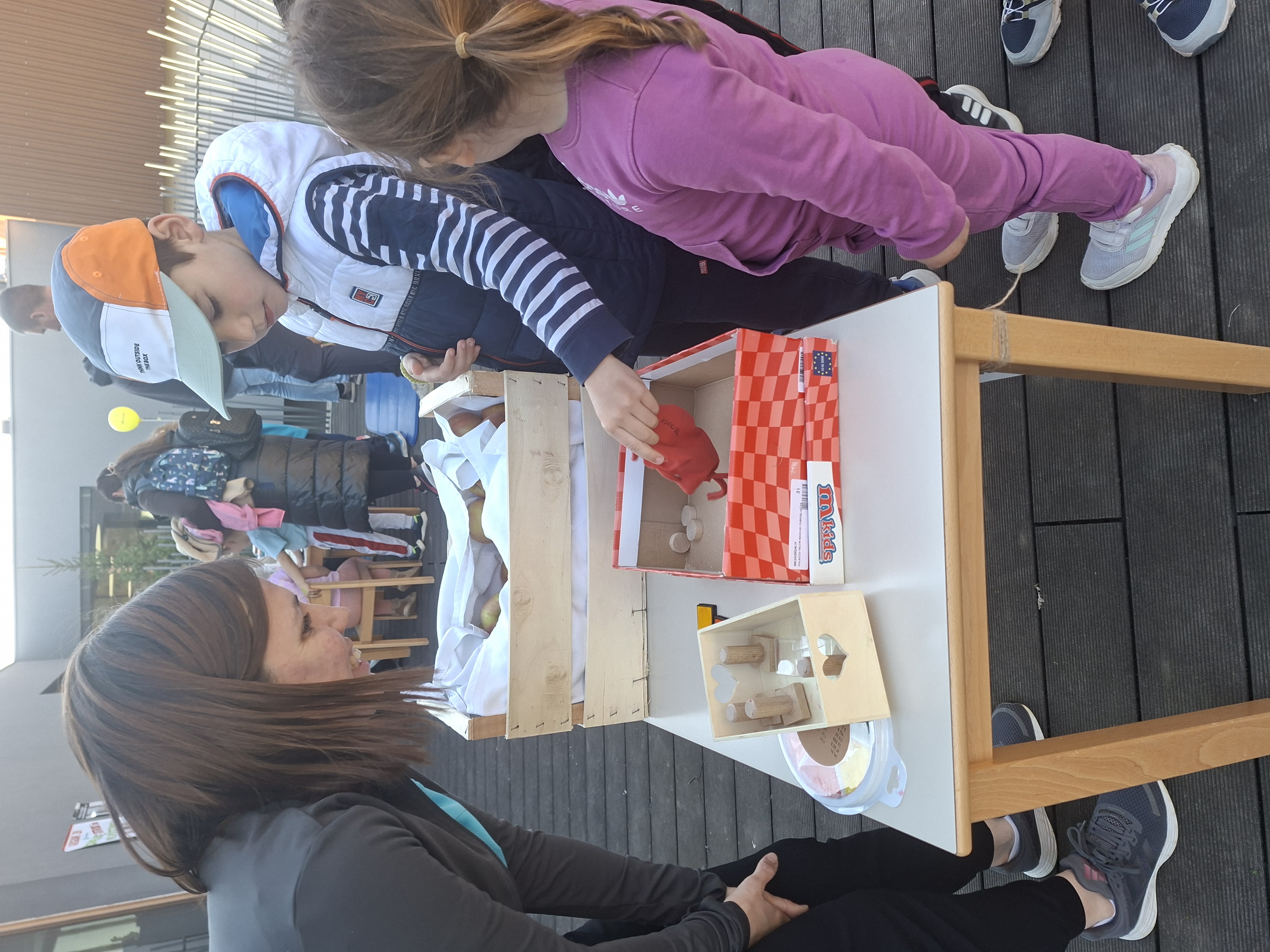 Otroci so na gibalnih postajah zbirali žetone in jih shranjevali v mošnjičke, ki so jih predhodno izdelali skupaj s starši. Ko so zbrali šest žetonov, so jih lahko “zamenjali” za zdravo nagrado – sočno jabolko.