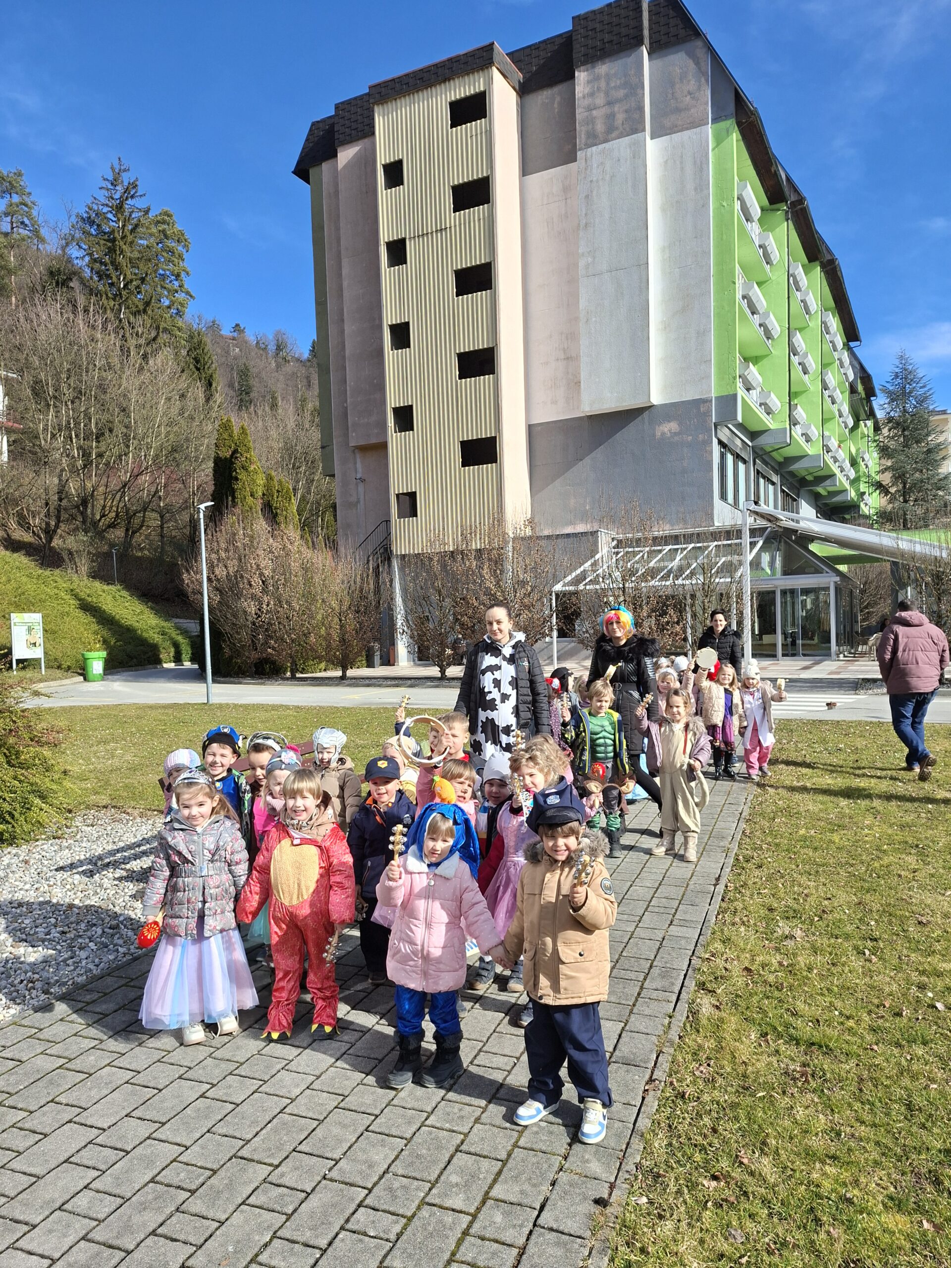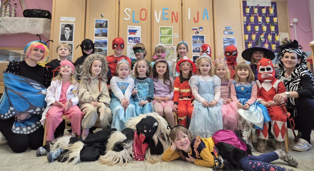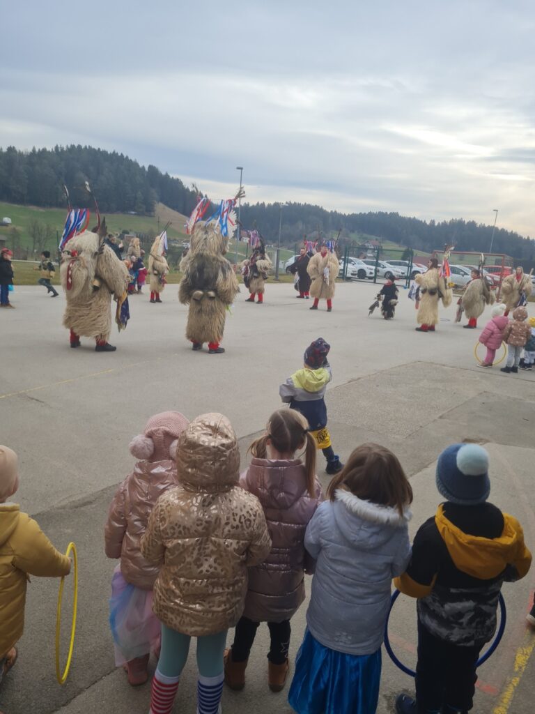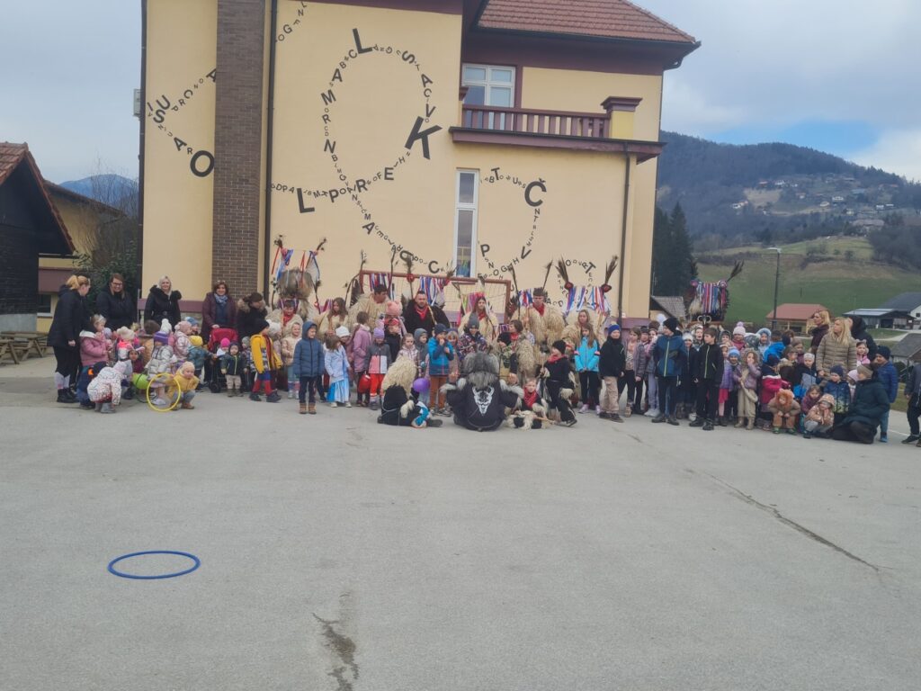 Pustni teden je v našem vrtcu potekal v znamenju veselja, barv in skupnega doživljanja. Ob obisku Košev šoštanjskih, Tresimirjev in kurentov so otroci skozi neposreden stik z obiskovalci iz lokalnega okolja doživljali medgeneracijsko povezovanje, sodelovanje in komunikacijo. S svojo energijo, zvonjenjem in tradicionalnimi maskami so obiskovalci navdušili najmlajše ter okrepili občutek pripadnosti skupnosti. Praznično okrašeni prostori z maskami, baloni in pisanimi okraski ter skupno pustno rajanje, v katerem so se otroci tudi sami našemili, so spodbujali sodelovanje, sprejemanje drugačnosti in prijetno sobivanje v skupini.